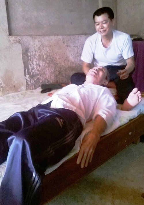 Phải khó khăn lắm, bà vợ ông T mới dìu được chồng đến nằm trên giường. Ông T không tự đi được, toàn thân rung giật liên hồi, đôi chân khập khiễng, chỉ cần người vợ buông tay là ngay lập tức, ông T ngã dúi dụi. Khi ông T đã yên vị ở giường, Viện bắt đầu “vận khí”. Tiếp đến, y túm lấy tay, chân ông T giật lia lịa. Đôi chân to khỏe ông Viện dẫm, đạp lên tấm thân gầy còm cõi chỉ còn da bọc lấy xương của ông T. Sau những lần bị giẫm đạp… ông T nhăn nhó, rên rỉ vì đau đớn, có lúc phải “rống” lên. Những lần như thế, “thầy” Viện lại hỏi to: “Có đỡ không ông, ông đau chỗ nào, thế đã đi được chưa?”. Hỏi xong, Viện lật người ông T và tiếp tục giẫm đạp. Bà H, vợ ông T cho biết, gia đình đưa ông T đến đây được đúng một tuần nay rồi. Vì ông T không đi lại được nên đành phải ở trọ cạnh nhà “thầy” Viện cho tiện việc chữa trị.
